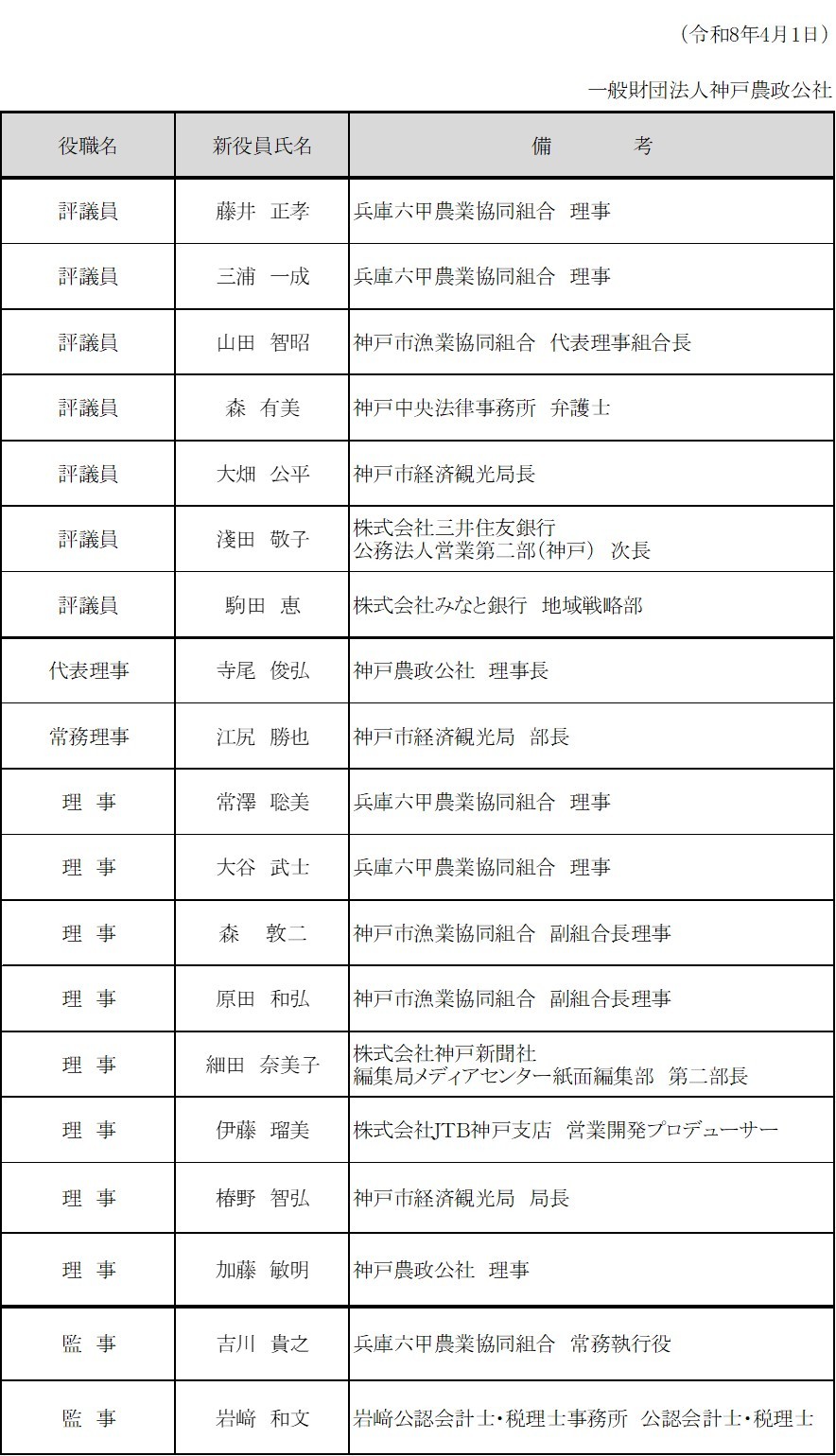 今後とも、一般財団法人神戸農政公社に対しまして、より一層のご理解とご支援を賜りますよう、謹んでお願い申し上げます。